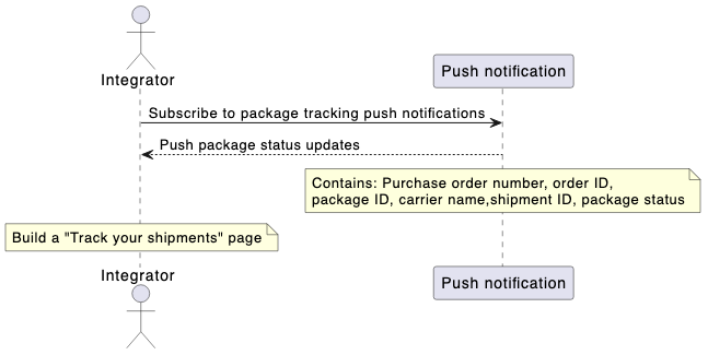 The package tracking push notification can support use cases that do not involve a user interface (UI). Examples include email notification systems, internal workflow triggers, and automated status updates based on real-time shipment notifications.