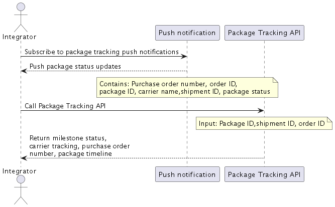 You can use both the Package Tracking API and push notification in a hybrid model. Instead of pulling shipping details on a schedule, this scenario uses the push notification as an event-based trigger for your system to call the Package Tracking API. Each push notification contains the required IDs to call the API, including the package ID, shipment ID, and order ID, so your system can call the API whenever you receive a notification. This model allows you to retrieve granular shipping data through an automated workflow.